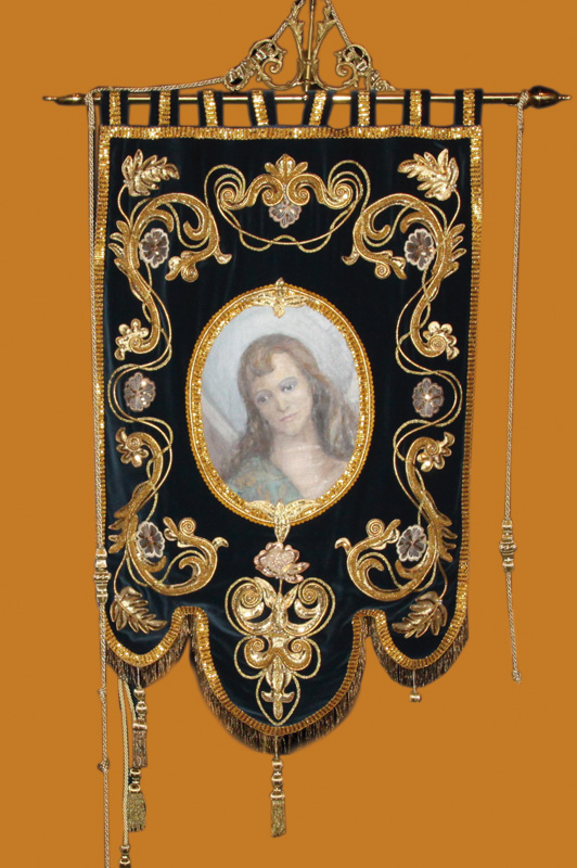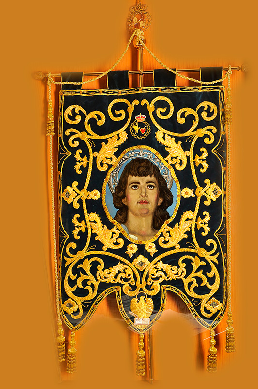 El año de realización fue en el 2012. Sobre el terciopelo de azul se encuentra una pintura con el rostro del Ángel. Está bordado con adornos vegetales en hilo de oro.