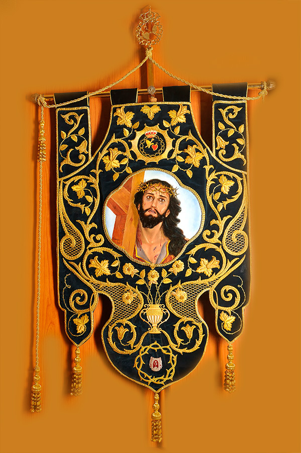 Fue realizado en 1998. En la parte superior, se puede observar el escudo de la Cofradía del Amparo, mientras el resto del adorno artístico son ramas de cenefas que enmarcan el óvalo donde figura el rostro del Ecce-Homo del paso. Completa el estandarte un cordón en oro viejo.