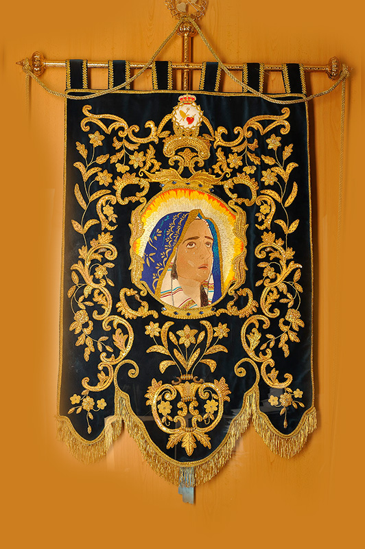 Sobre un terciopelo de color azul, esta bordado el estandarte de la Virgen de los Dolores, en el año 2004, en la parte superior, el escudo de la Cofradía sobre el color blanco que corresponde a su hermandad; mientras el resto está adornado con ramos de rosas que acogen en el centro la bella faz de la cotitular de la Cofradía, María Santísima de los Dolores.